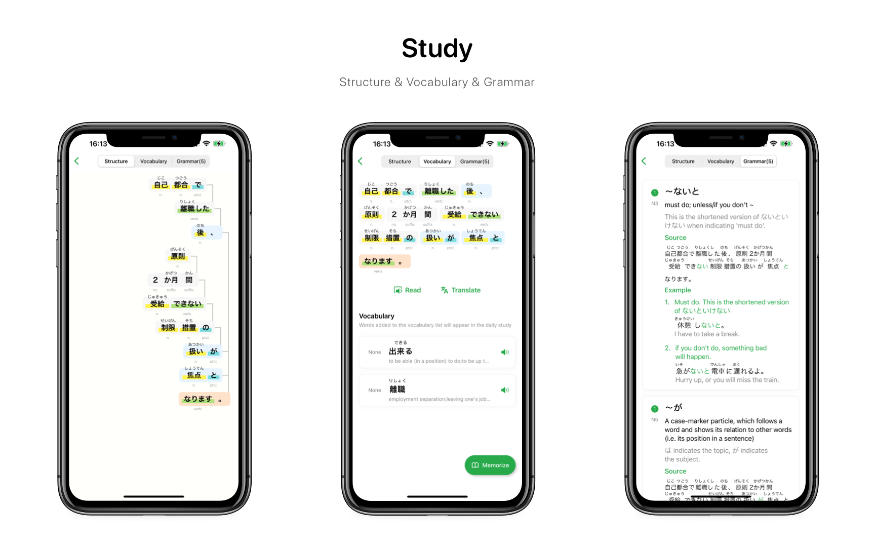 When you click the “Study” button, you’ll see three sections: Structure, Vocabulary and Grammar.
