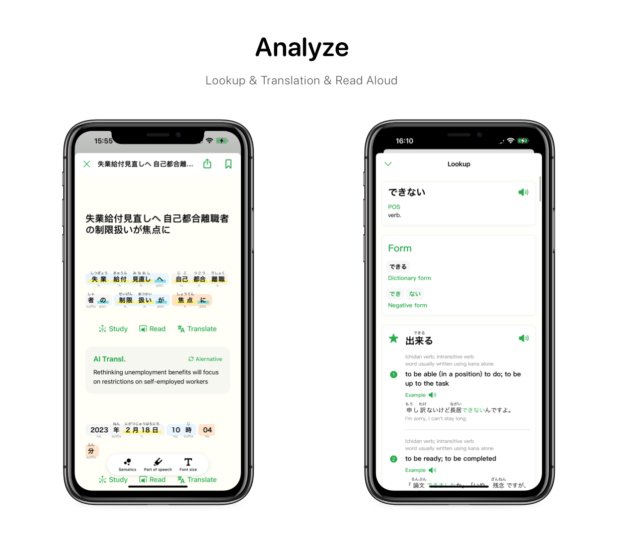 You can tap on any word or phrase to see its meaning, pronunciation, part of speech, and example sentences.