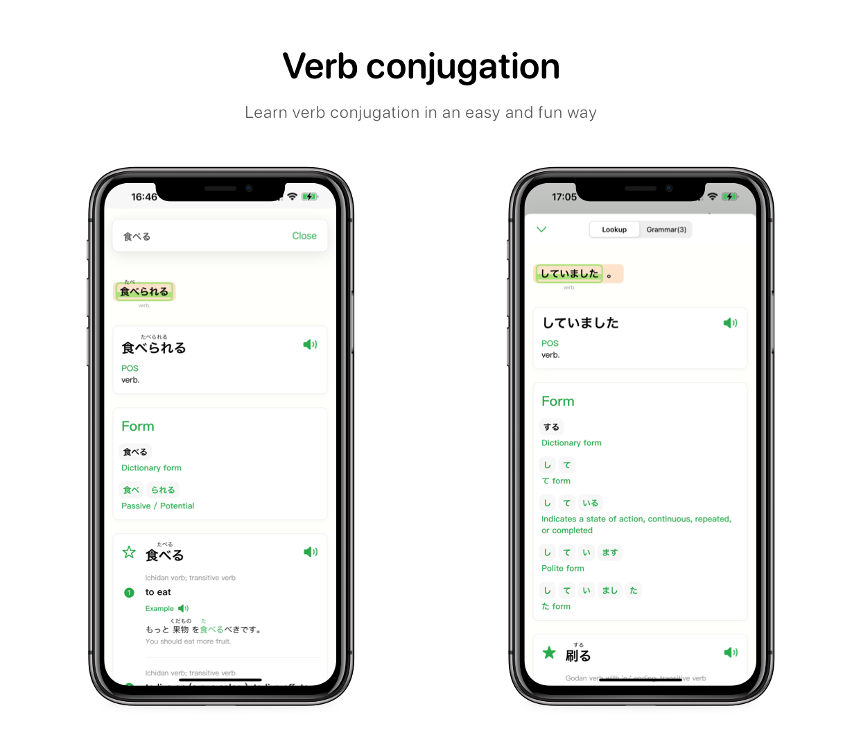 For example, the verb 食べる (taberu), which means “to eat”, can be conjugated into dozens of forms such as 食べます (tabemasu), 食べない (tabenai), 食べさせる (tabesaseru), 食べられる (taberareru) and so on. Each form has a different meaning and usage that you need to master in order to communicate effectively in Japanese.